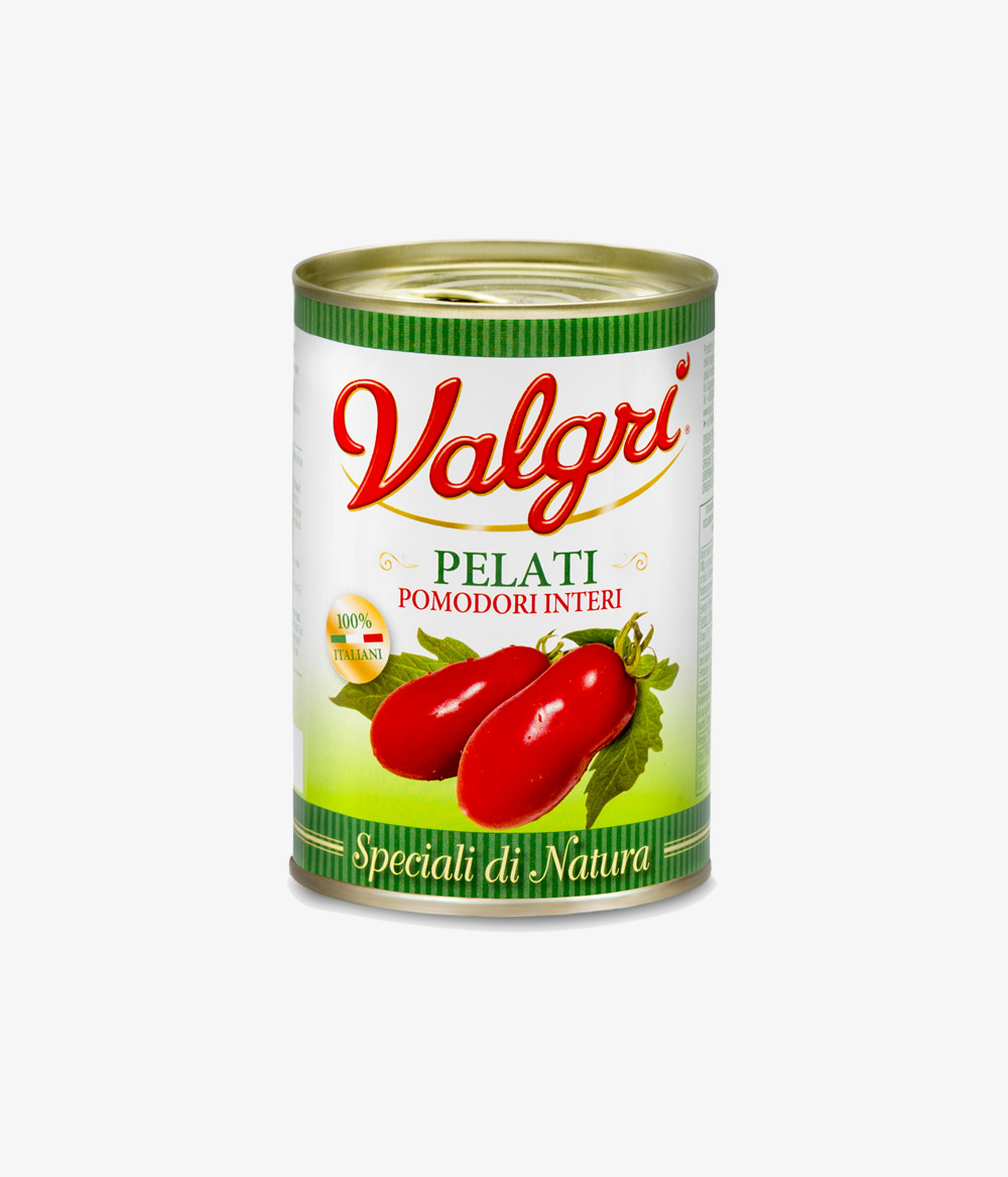 The Valgrì tinned peeled 100% Italian tomatoes represent the authenticity of the tomato: processed from fresh, without the skin and preserved in their juice, maintaining an intense colour and a characteristic flavour.